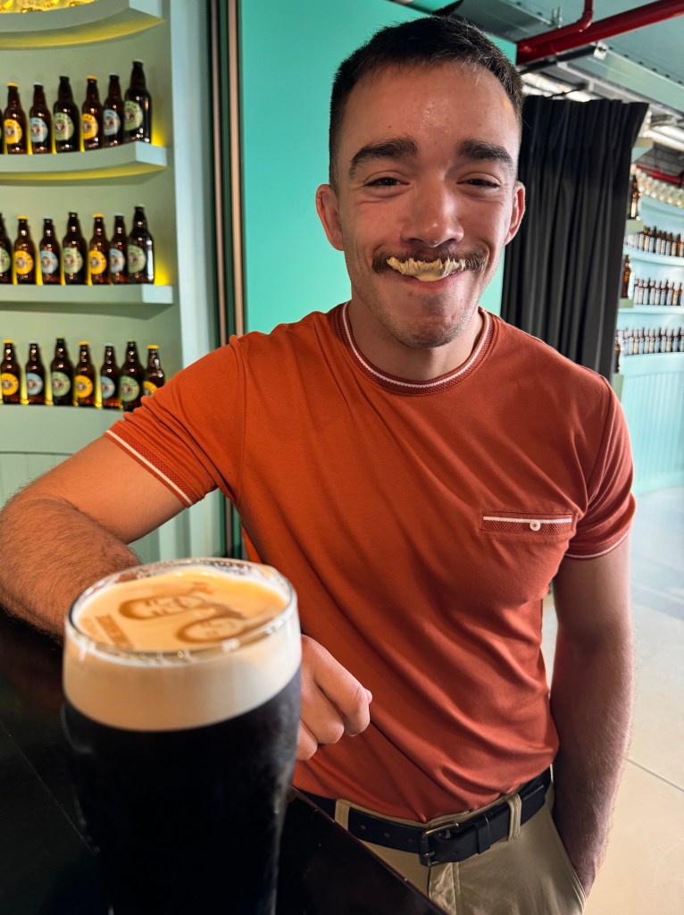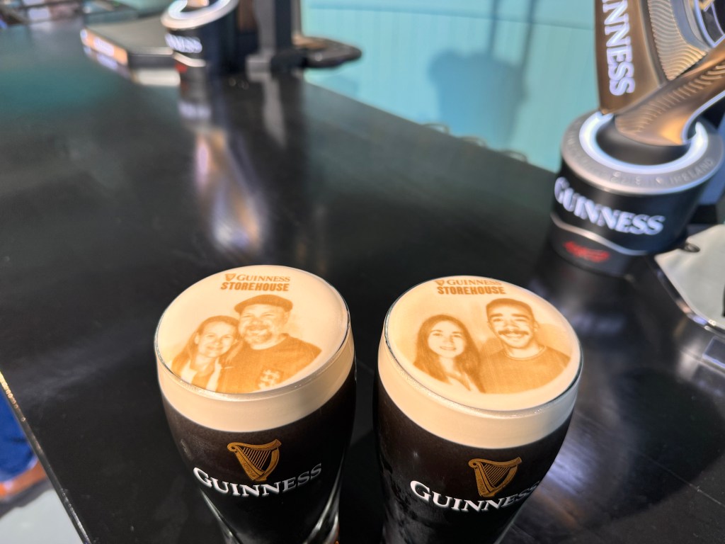 The coolest thing though was the beer foam picture. That’s right, they print your picture on a pint of Guinness! We had to do this. It cost eight Euros and was worth every penny. Emma and Patrick got a pint with their picture and Tassa and I got one with ours. They use a butter mixture and a laser printer, and it etches your picture on the top of the beer foam. The most amazing thing is that the foam and the picture lasts until the beer is finished. When you are drinking a Guinness in Ireland the last thing you do is slurp the big glob of foam at the bottom of the glass. Yum!