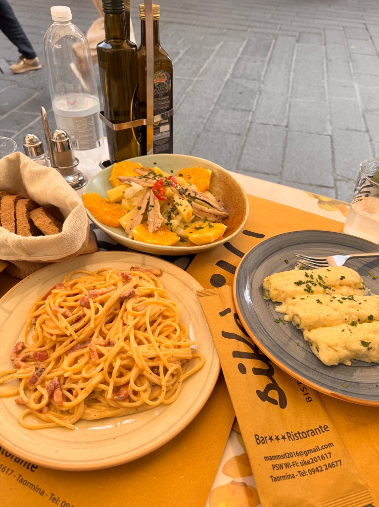 The food in Taormina was amazing. We have always heard that the food in Italy is second to none. I thought it was hit or miss. A few places that we went to before going to Taormina were not that great. A restaurant sort of near our Airbnb was just ok. I had shark pasta, and it was just small chunks of dry shark meat on spaghetti. The worst meal that I have had since moving over here though was in the town of Nicolosi. This was our second day in Italy, and I wanted pizza. Nicolosi is a small town on the way up to Mt. Etna. We found a restaurant, but they only served pizza in the evening. They had a lot of different burgers for lunch instead. By the way, a burger over here is anything on a bun. For example, they call chicken sandwiches burgers. Well, we noticed that horse meat was served a lot in restaurants in Sicily. Maybe its Italy in general, I don’t know, but horse is definitely served in Sicily. Horse and donkey. I’m not kidding. We even saw a horse butcher shop. Plus, you had to Google translate everything on the menus, so it was difficult sometimes to know exactly what you were ordering. I ordered some crazy burger at this restaurant, and it was terrible. I hope to god it wasn’t horse. I honestly don’t know. I ate some of it, but I almost threw up because of the taste and the thought that it might be horse meat. However, in Taormina the food was so good. We had the best cannoli. We had amazing pizza. We also had carbonara for the first time in our lives. I have no idea why we never had this before but I’m glad because it was a total surprise and let me tell you the carbonara in Italy is insanely good. Another thing that I fell in love with is grappa. Grappa is brandy but a lot different from a French brandy, like cognac. It is simpler and a bit rougher but overall, more versatile and interesting. I may have said this before in another post, but here in Europe there is a craft and dedication to the quality of food and drink that in general doesn’t exist in America. Sure, you can get good stuff in America, but in Europe almost everything, from a cheap croissant at a bakery to an expensive dinner is just on another level. Except the eating of horse. I can’t deal with that.